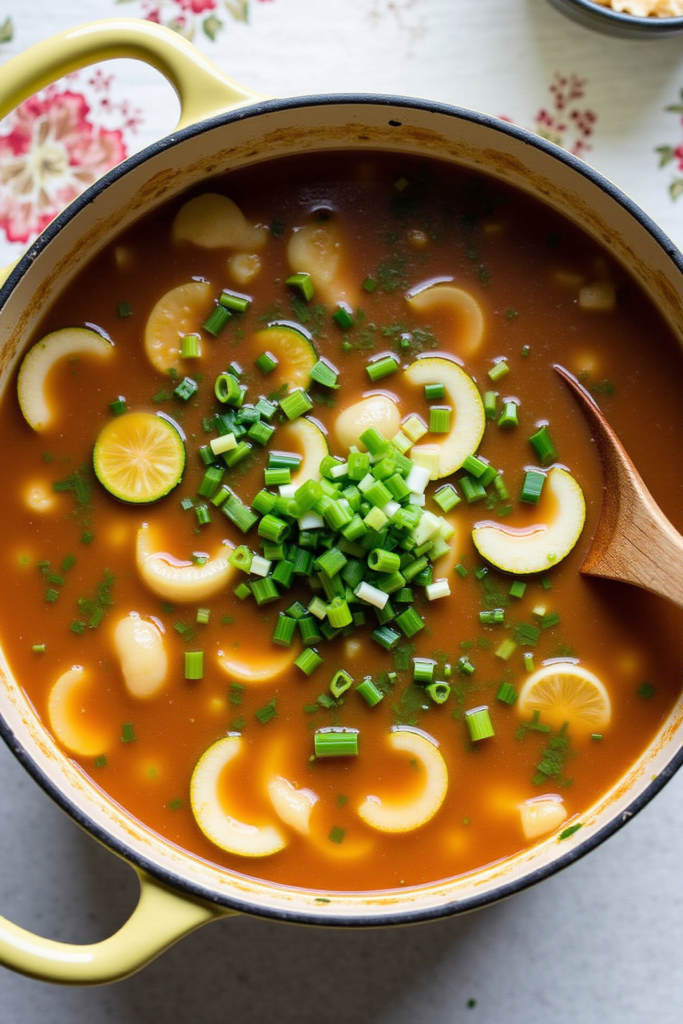 - Ladle the soup into bowls. Top with sliced scallions, a sprinkle of toasted sesame seeds, and an optional citrus wedge for brightness. Serve hot and enjoy!