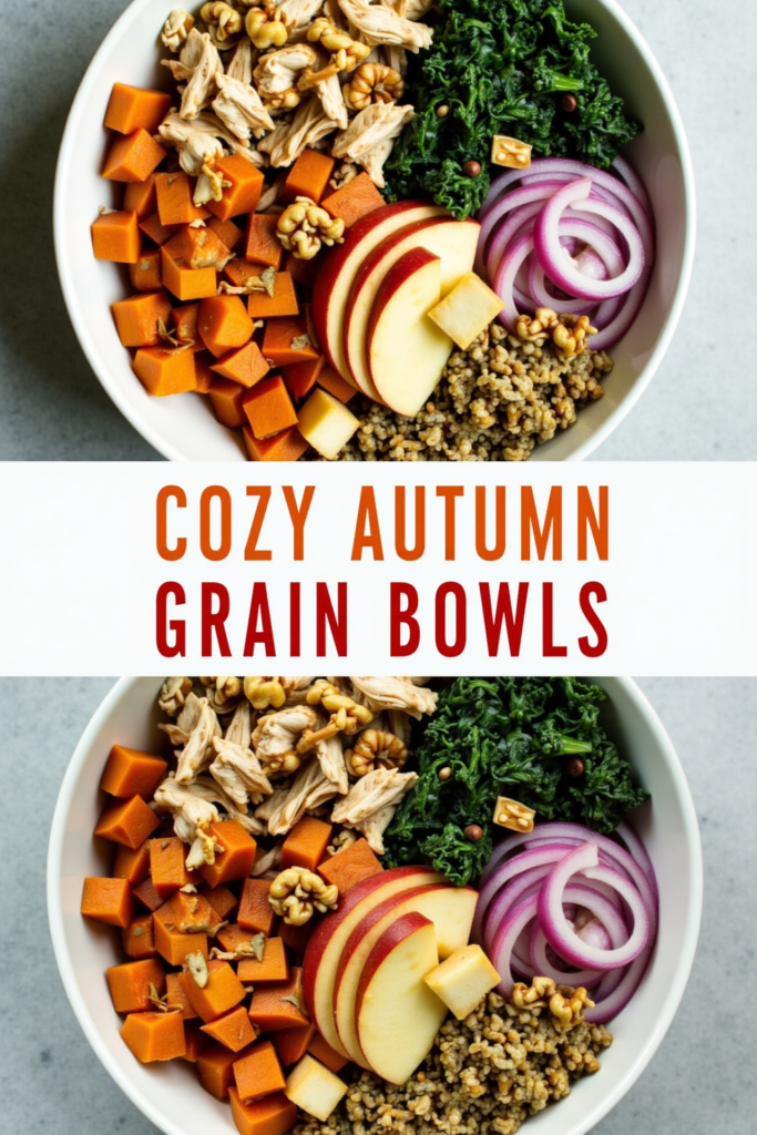 Enjoy these Cozy Autumn Grain Bowls on their own, or pair with toasted sourdough or a light soup. For extra heartiness, add shredded rotisserie chicken or sliced turkey. Vary the toppings according to your preference: dried cranberries, pomegranate seeds, or sautéed greens all make wonderful additions.