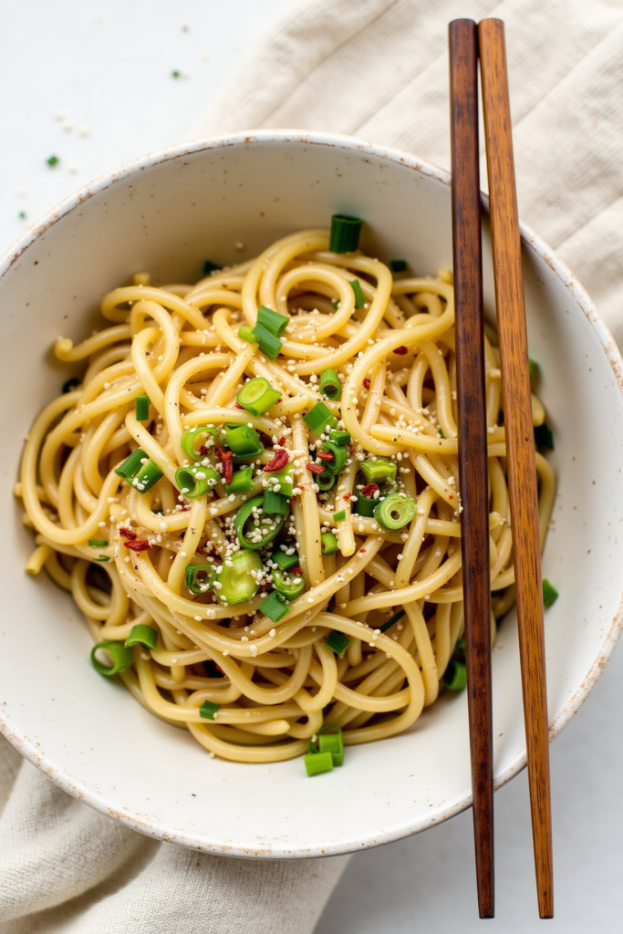 Toss freshly cooked noodles (lo mein, spaghetti, soba, or rice noodles work well) in the hot garlic sesame sauce immediately so they soak up the flavors while still warm. For added texture and color, sprinkle with sliced scallions and toasted sesame seeds. Want to take it to the next level? Add shredded carrots, cucumber ribbons, or quick-pickled veggies for brightness and crunch.