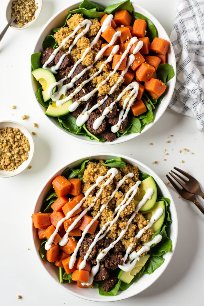 For the signature sauce, simply stir together plant-based yogurt, tahini, fresh lemon juice, garlic, and a pinch of sea salt. Whisk until silky smooth. This sauce not only adds a rich, nutty flavor but also delivers healthy fats and plant-based protein, making your bowl even more nourishing.