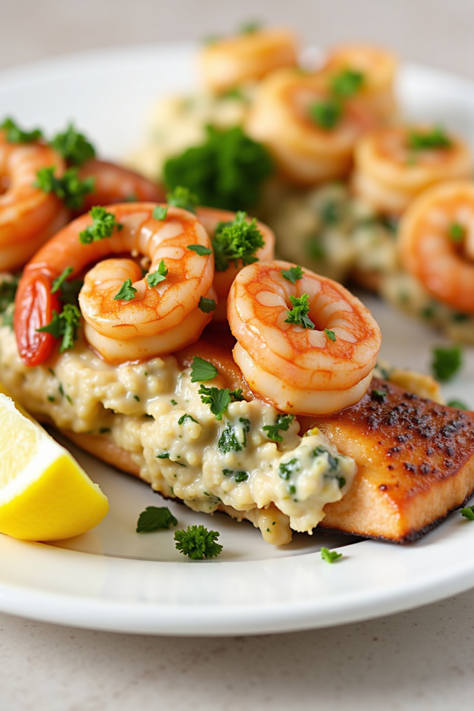 The heart of this dish is its creamy crab and shrimp stuffing. The combination of softened cream cheese, tender claw crab meat, and diced shrimp is elevated with fresh herbs, a touch of lemon, and a sprinkle of parmesan. The filling is whipped until smooth, then gently folded with seafood so every forkful is indulgent without overpowering the delicate salmon.