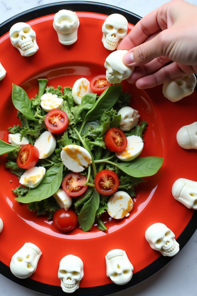 Serve your salad on a dark slate or black plate to make the skulls pop. Add a few extra basil leaves or edible flowers for a wickedly fun touch. Pair it with crunchy breadsticks or crusty baguette slices to complete your Halloween tablescape, and watch your guests be delighted by both its taste and presentation.