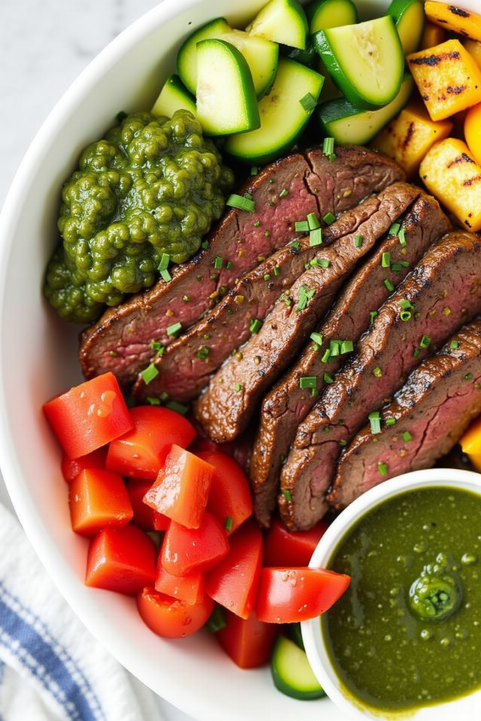 Once your steak is grilled and the grains are cooked, it’s time for that chef’s touch: arrange everything artfully in a bowl, layering the grains, steak slices, vegetables, and a generous sprinkle of crumbled feta. Add a dollop of homemade cucumber-yogurt sauce, and finish with a sprinkle of fresh parsley or dill for a restaurant-quality presentation.